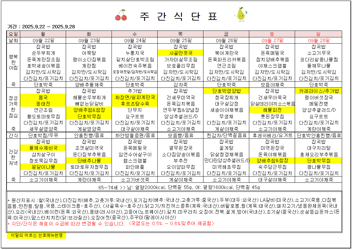 2025년 9월 4주 주간메뉴